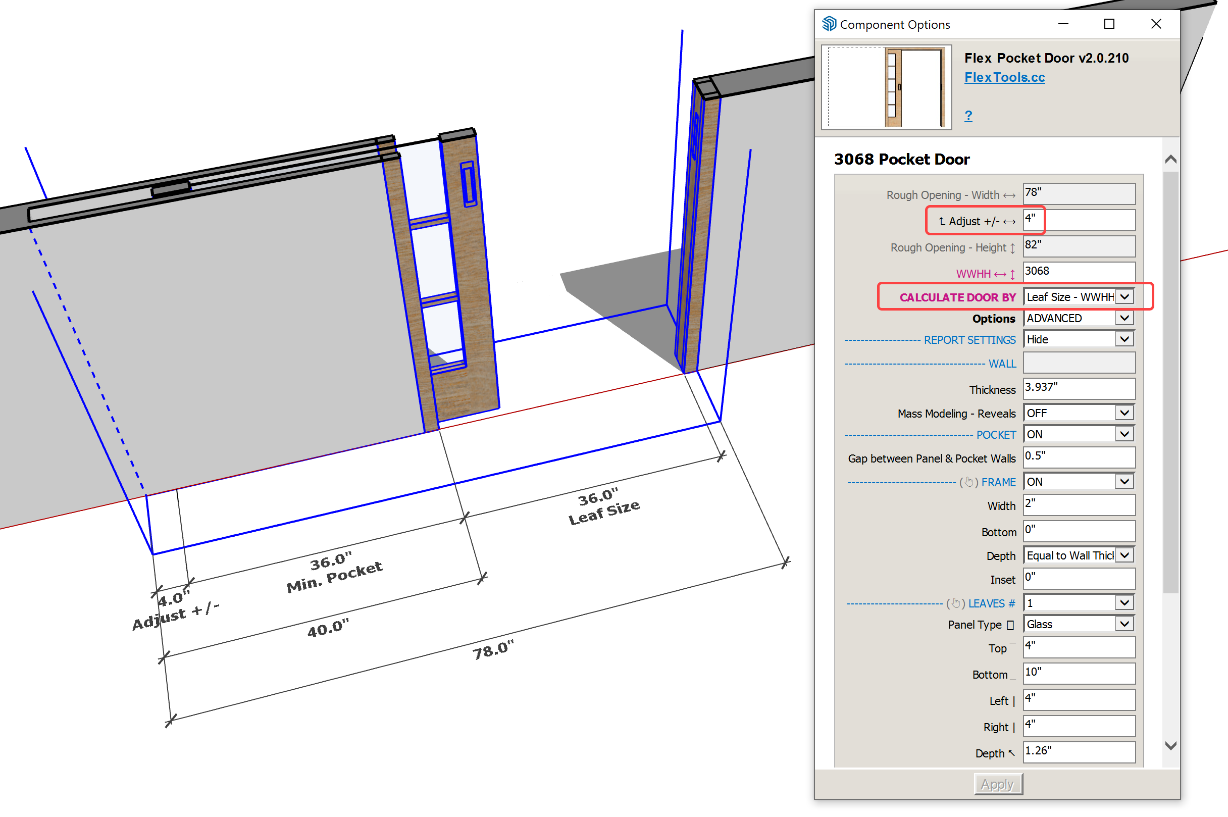 - New adjustment parameters for fine-tuning exact sizing of the rough opening OR the leaf size (depends on your chosen calculation method). To fine tune the pocket door turn on Advanced Options and an 'Adjust +/-' setting will appear at the top.